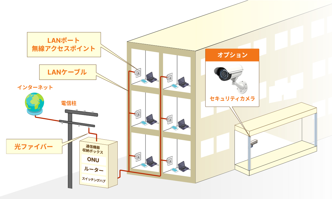 各お部屋まではLAN配線を行います。建物の構造によってはLAN配線がおこなえない場合もございます。