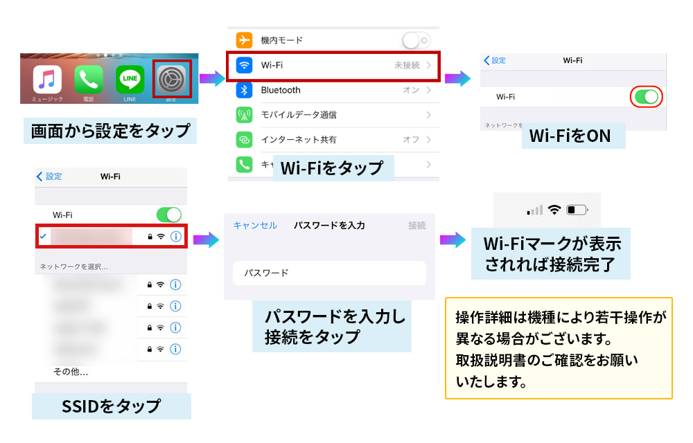 ①設定を開いてWi-FiをONにする。